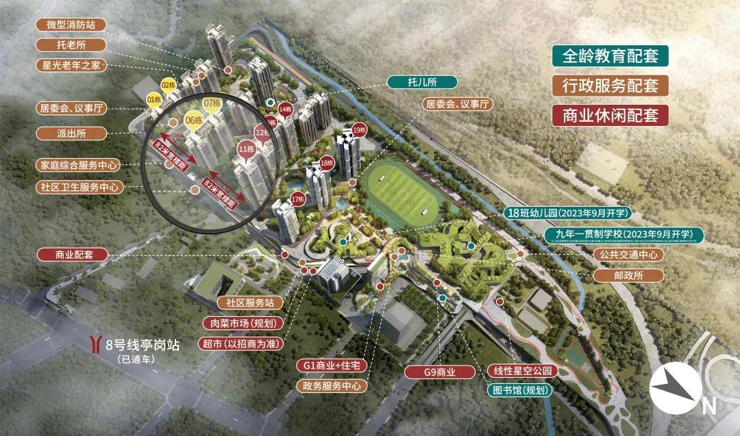 以“全龄段关怀”为核心,打造约18万平方米无围合中央园林(相当于8个标准足球场大小),实现社区空间的最大化共享。内部规划细分年龄段的儿童游乐区,配备滑滑梯、攀爬架、沙坑等丰富游乐设施,满足3-12岁儿童的玩耍与成长需求;设置约1.2公里青年健身跑道,环绕园林布局,沿途配备休憩驿站与照明系统,为业主提供便捷的运动空间;打造专属长者活动中心,配备休闲座椅、太极推手器、漫步机等健身器材,同时规划邻里交流庭院,为老年人提供舒适的社交与活动场所,真正实现“老中青少”全龄段业主的宜居需求。